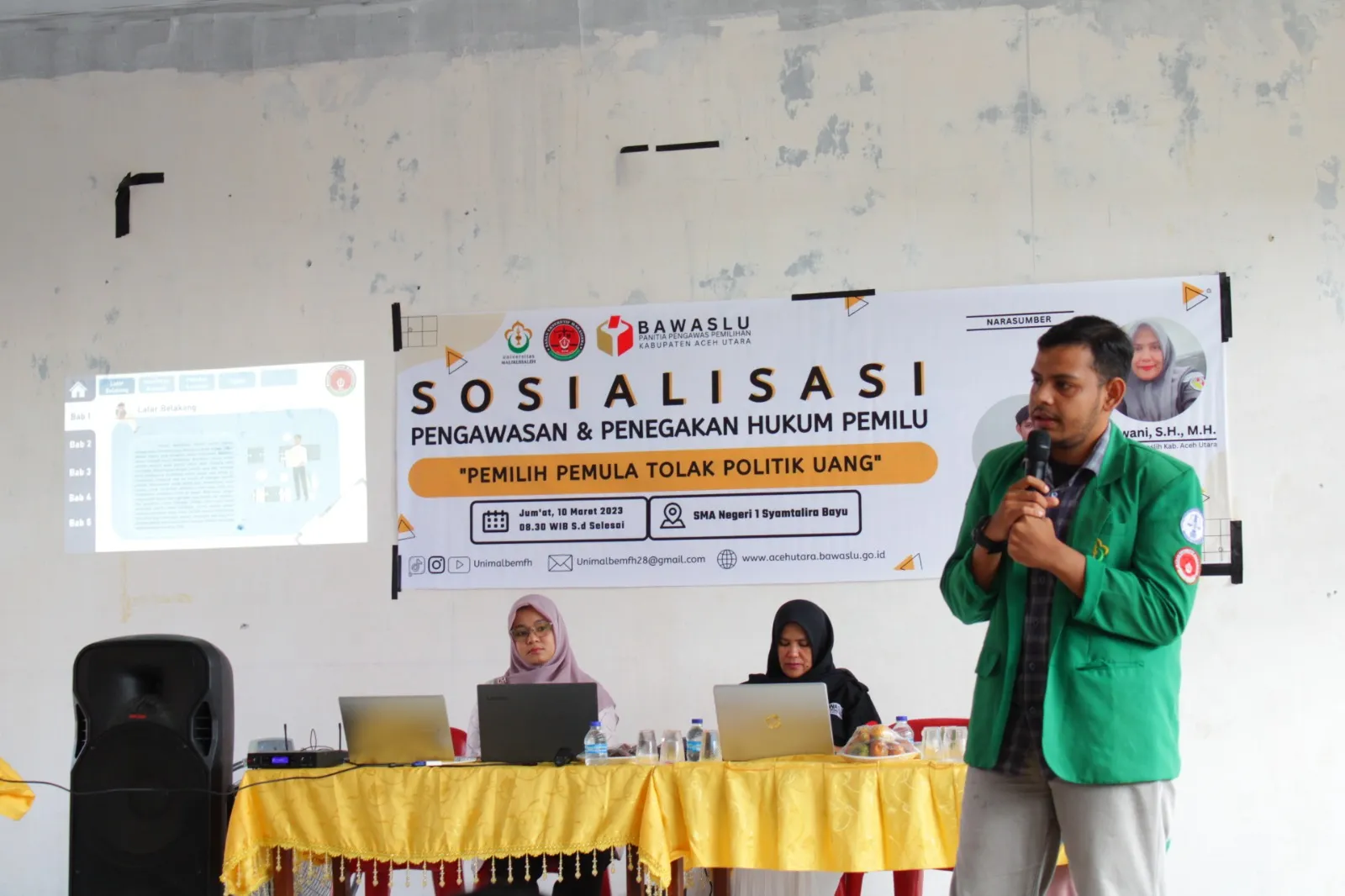 Newsrbaceh.com | LHOKSEUMAWE –Badan Eksekutif Mahasiswa (BEM) Fakultas Hukum Universitas Malikussaleh berkolaborasi dengan Panitia Pengawas Pemilihan (PANWASLIH) Kabupaten Aceh Utara kembali menggelar kegiatan Sosialisasi Pengawasan dan penegakan hukum pemilu. Acara tersebut mengusung tema “Pemilih Pemula Tolak Politik Uang”. Pelaksanaan acara tersebut berlangsung di SMA Negeri 1 Syamtalira Bayu, Sabtu (11/03/2023).