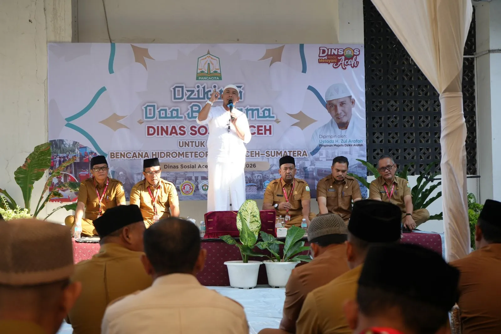 Acara yang berlangsung khidmat ini dipimpin oleh Ustadz H. Zul Arafah, Pimpinan Majelis Dzikir Arafah, serta diikuti oleh seluruh pegawai Dinas Sosial Aceh yang berjumlah 246 orang, bersama relawan sosial dan mitra kebencanaan.