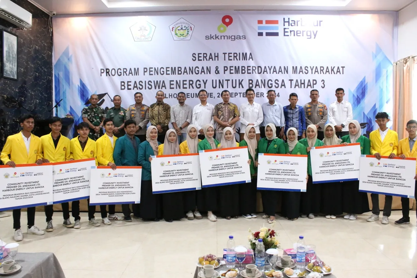 Newsrbaceh.com | Lhokseumawe – Harbour Energy/Premier Oil Andaman Ltd serah terima Program Pengembangan dan pemberdayaan Masyarakat beasiswa energy untuk bangsa tahap ke 3 tahun 2024 kepada 23 mahasiswa di hotel rajawali, Kamis 26 September 2024.