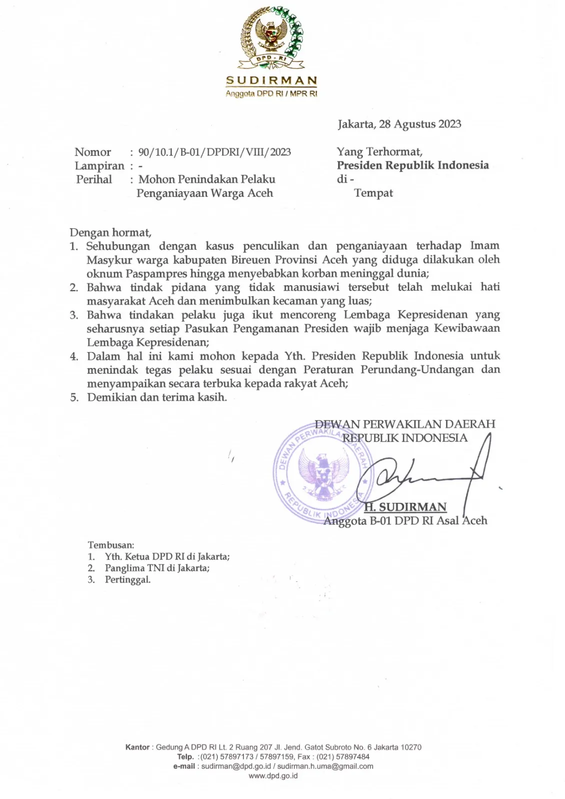 Surat yang bernomor 90/10.1/B-01/DPDRI/VIII/2023, dikirimkan pada tanggal 28 Agustus 2023, tidak hanya menyampaikan keprihatinan mendalam atas insiden tragis ini, tetapi juga mengekspresikan harapan besar untuk mengadili pelaku sesuai hukum yang berlaku. Surat ini juga ditembuskan kepada Panglima TNI, menunjukkan skala seriusnya situasi.
