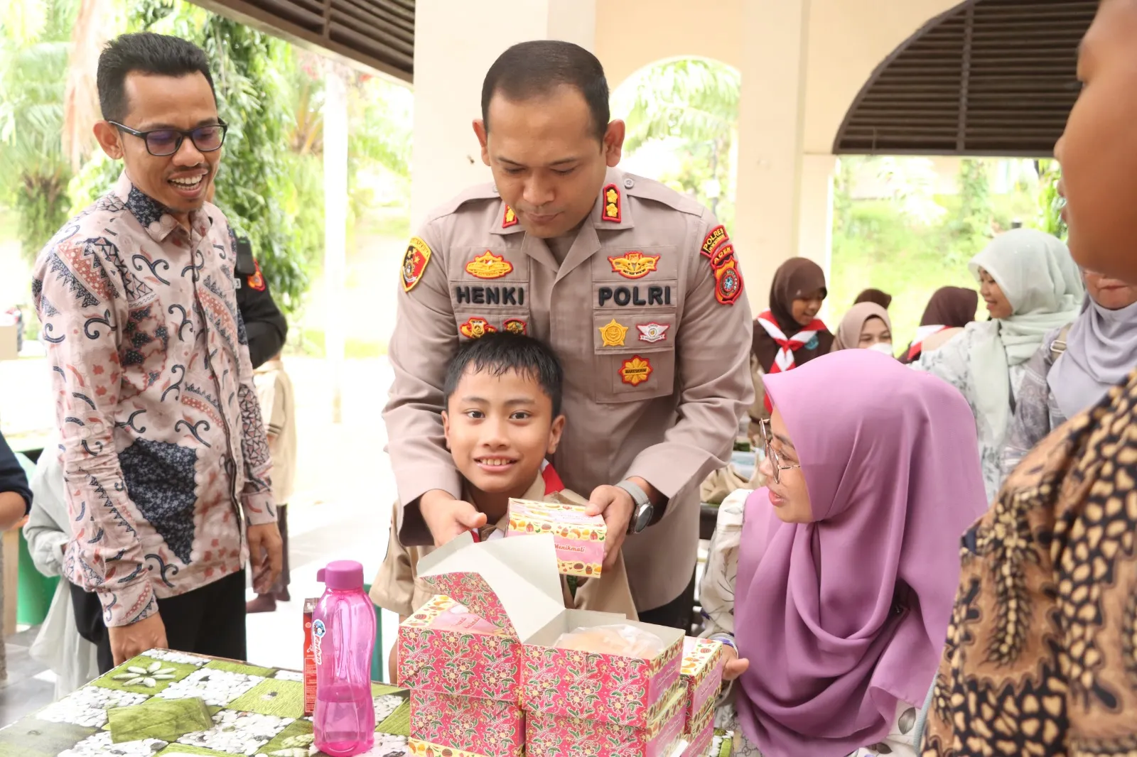 Tampak Kapolres Lhokseumawe beserta rombongan melihat Stand Seni dan Makanan yang diperjual belikan oleh Anak – Anak Sekolah Sukma bangsa yang di Pajang dan diperjualkan di Halaman di Sekolah.