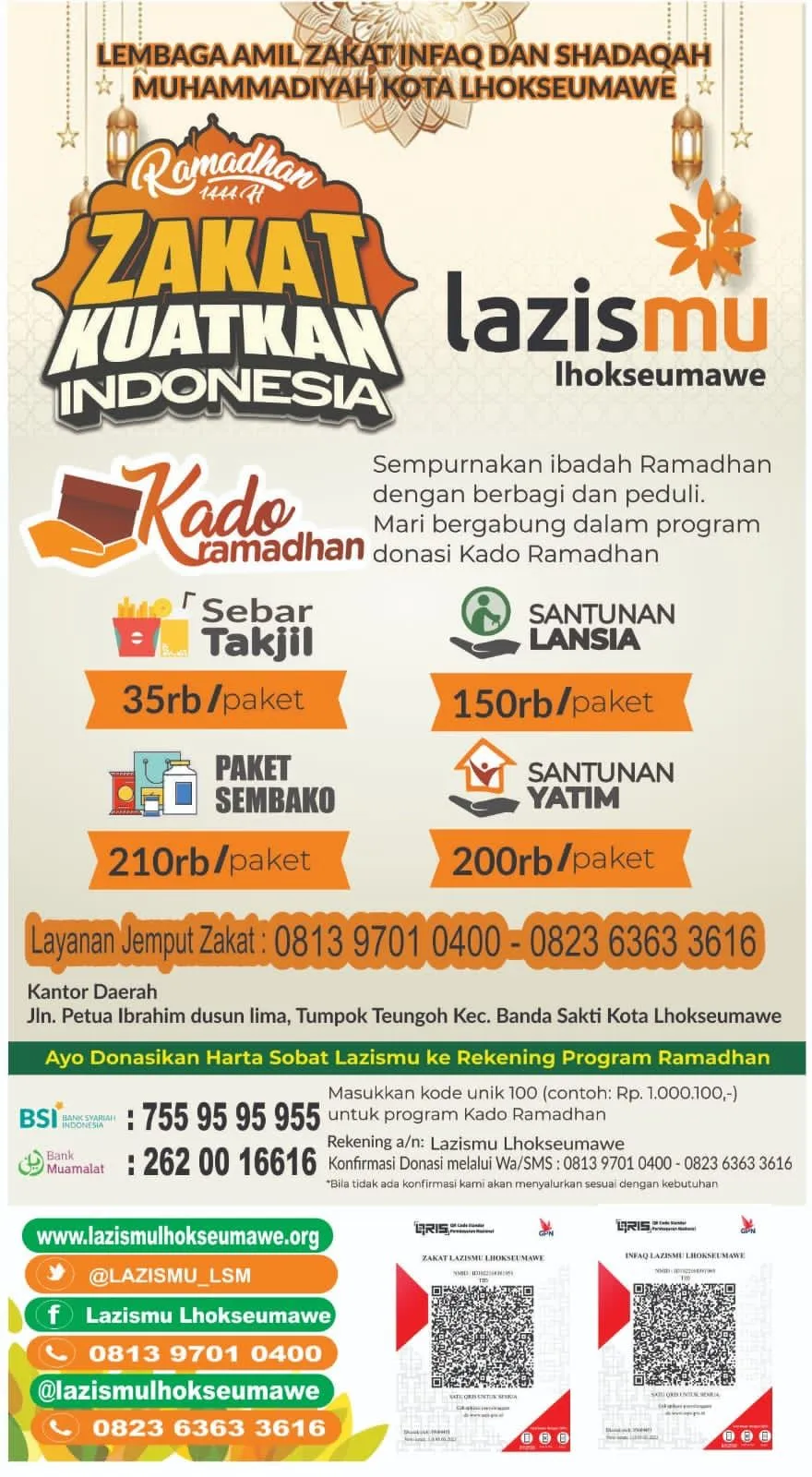 Donasi dapat disalurkan melalui Rek. Bank BSI dengan No. 755 95 95 955 serta Bank Muamalat dengan Rek. No.26200 16616 an Lazismu Lhokseumawe serta Konfirmasi pengiriman ke No.WhatsApp 0813 9701 0400 / 0823 6363 3616.