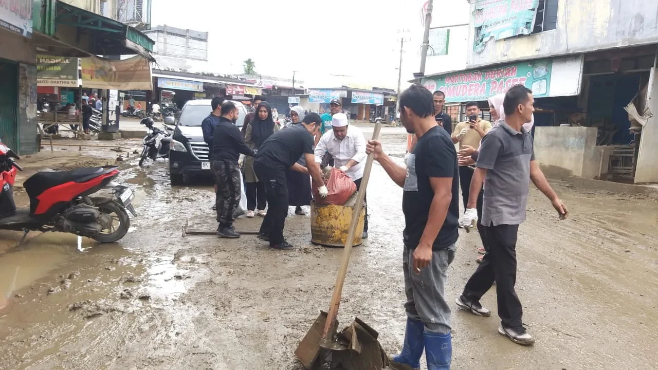 Kegiatan pembersihan difokuskan pada penanganan sisa material banjir, khususnya lumpur yang menumpuk di badan jalan dan di depan pertokoan. Endapan lumpur tersebut sebelumnya menyebabkan akses masuk ke sejumlah toko terganggu, sementara pada beberapa titik kondisi jalan masih licin dan sulit dilalui.