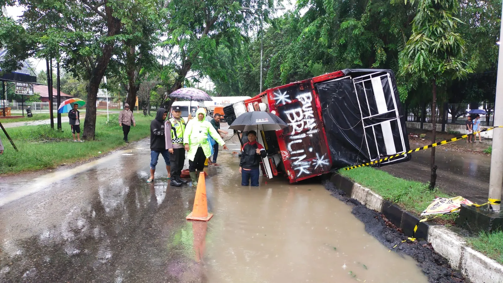 Di tengah hujan lebat, personel Polsek Muara Satu bersama unit lalu lintas memasang garis pengaman, mengatur arus kendaraan, serta membantu proses evakuasi badan truk yang terbalik guna mencegah kemacetan pada jalur utama tersebut.