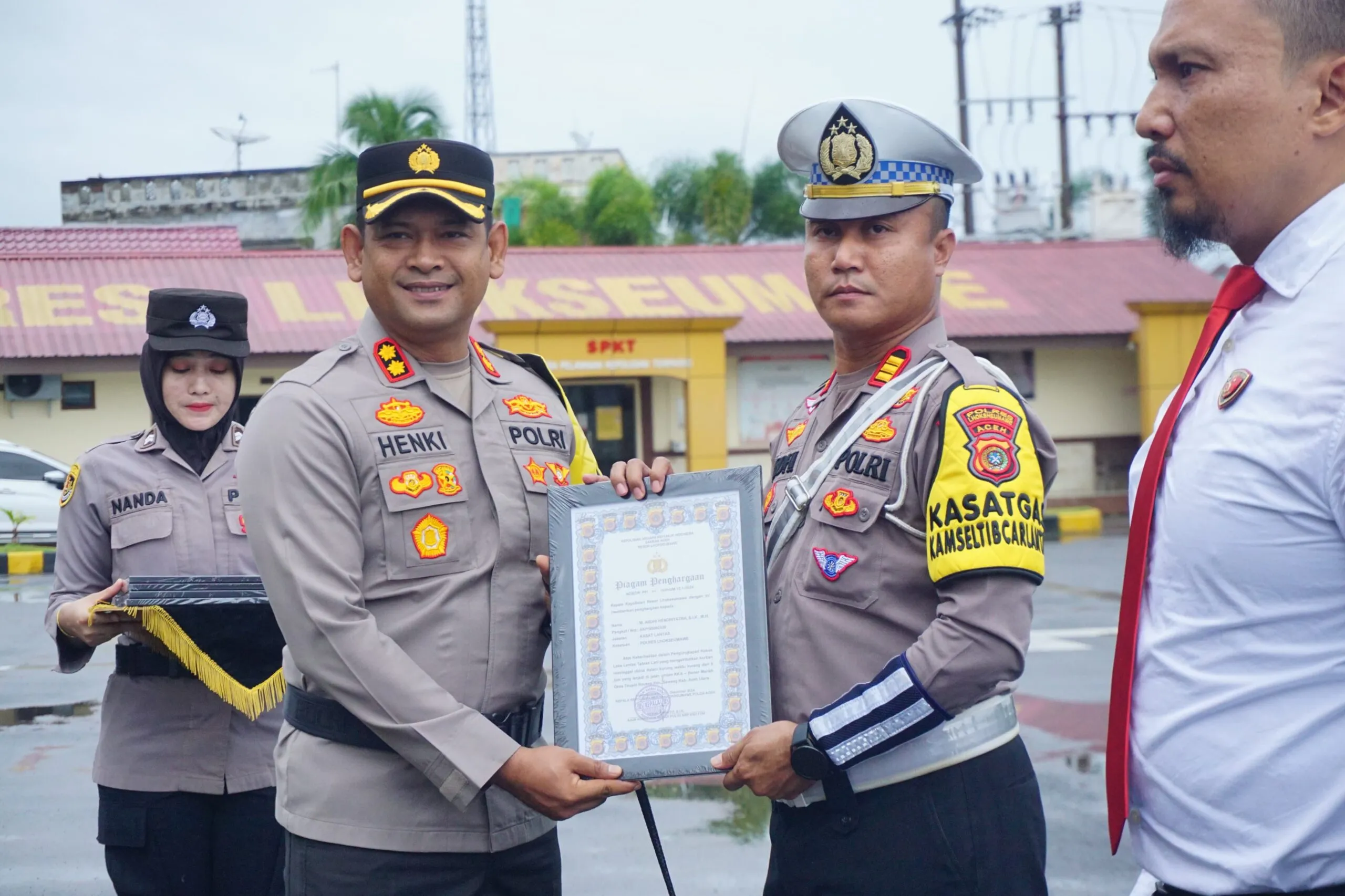 Newsrbaceh.com | LHOKSEUMAWE – Kapolres Lhokseumawe, AKBP Henki Ismanto, S.I.K memberikan penghargaan kepada sejumlah personel yang dinilai berprestasi dalam melaksanakan tugas. Kegiatan tersebut berlangsung di halaman Mapolres Lhokseumawe, Senin (30/12/2024)pagi.